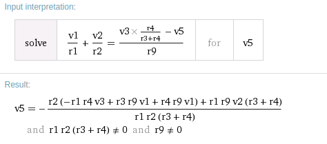 solve(v1/r1 + v2/r2 - ((v3*(r4/(r3+r4)))-vo)/rf, vo)